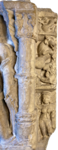 A large and sensuous light beige sandstone relief figure of a Chanwardharini (female fly-whisk bearer), standing between two ornate pillars and wielding a chowri (ritual fly whisk), adorned with extensive jewellery and flanked by attendants and a leogryph (Yali).
